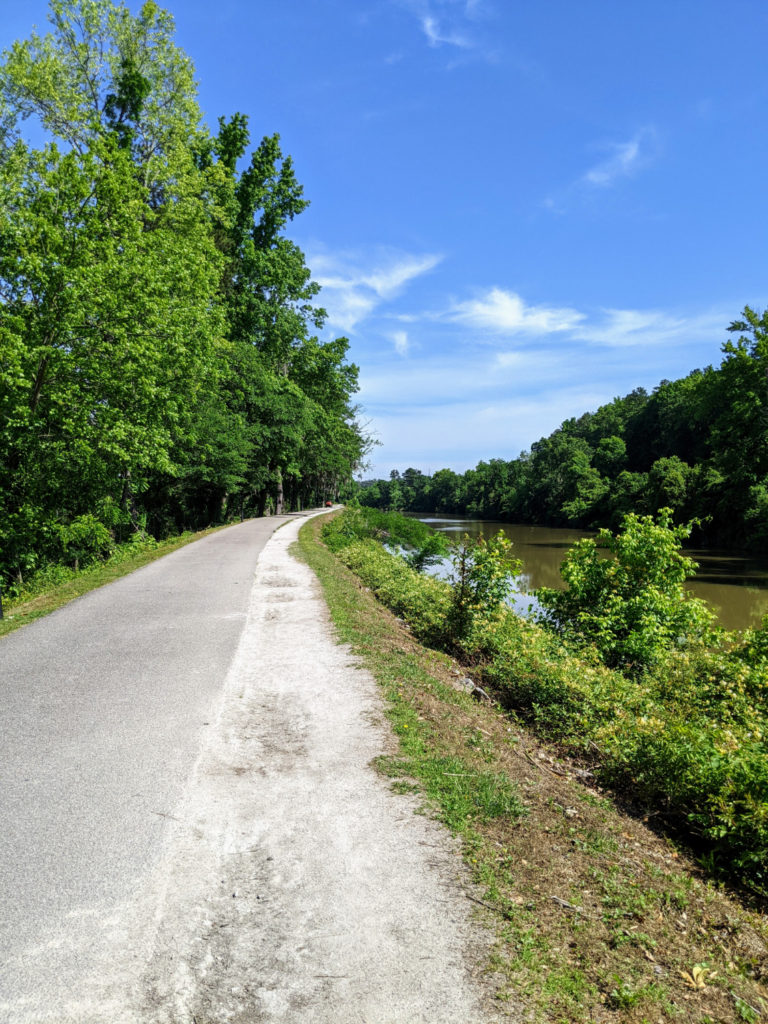 The Columbia Canal and Riverfront Park seems to be the primary section of the Three Rivers Greenway system and is definitely the most crowded. There are mile markers along this section – this is the only stretch that does – and it’s just over 2.5 miles from the parking lot off Huger Street to the Broad River Canal Riverfront Park. A shaded trail makes a loop closer to the river, so you could start from the Broad River Canal end and make the shorter loop (2-3 miles?) or walk a little over 5 miles round-trip from the downtown end. A short spur heading south is currently closed.