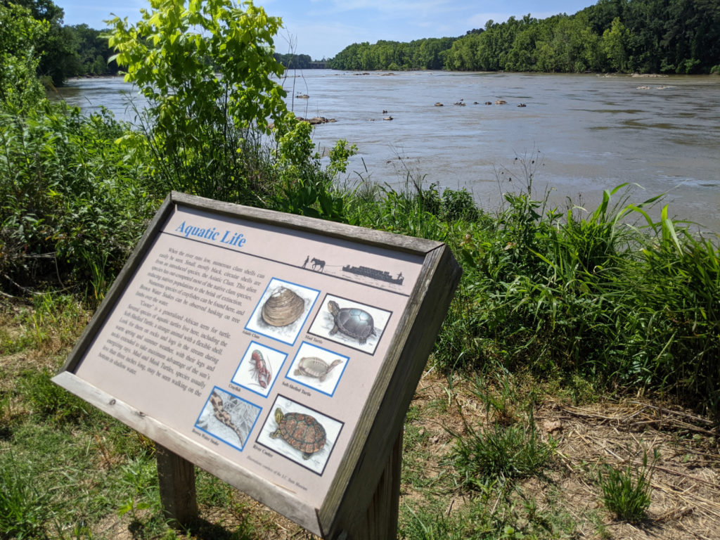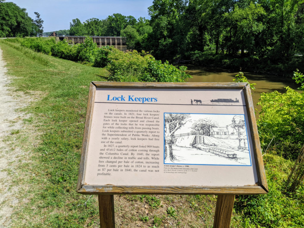 The Columbia Canal and Riverfront Park has parking and bathrooms on each end. At the downtown/south end, there is a huge parking lot off Huger Street, near a marionette theater on Laurel and Gist Streets, with plenty of signage. The bathrooms are located at the bottom of the hill, next to the canal. At the north end is a sandy parking lot at the Broad River Canal Riverfront Park, while the bathroom is in the old canal house on the dam. There’s one extra access point at the Broad River Bridge but no parking or bathrooms.