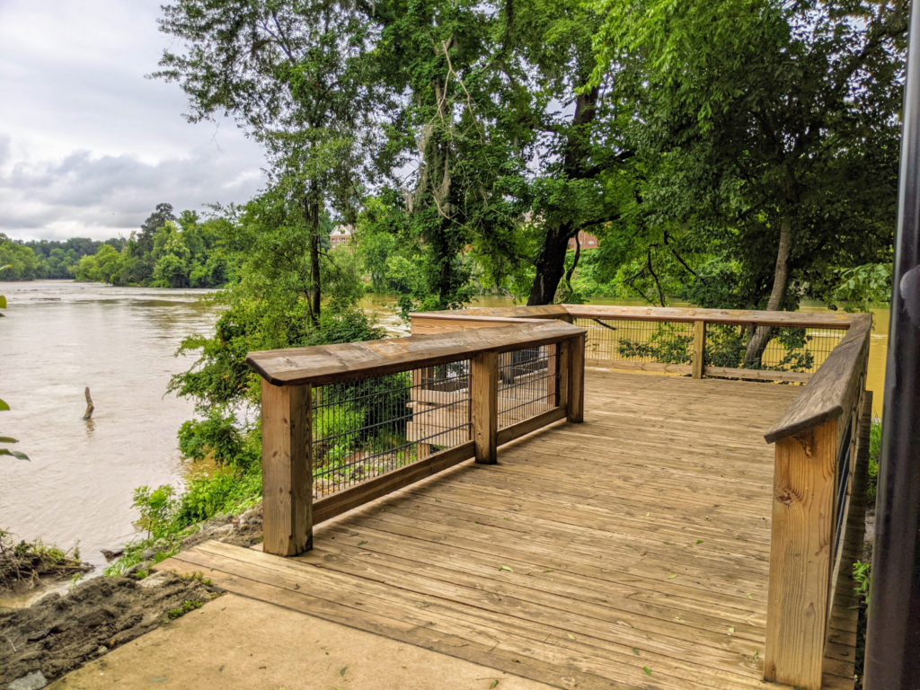 South of the West Columbia Riverwalk on the Congaree River are several more entrances to the Cayce section of the riverwalk. There’s “phase 3 access” at a small parking lot (no restrooms) off Old State Road. The other end of this section is at the Thomas Newton Public Boat Landing which has a large parking lot (but also no restrooms.) But the riverwalk continues down to a “phase 4 access” spot past the Cayce Tennis and Fitness Center (gravel lot/field, no restrooms.)