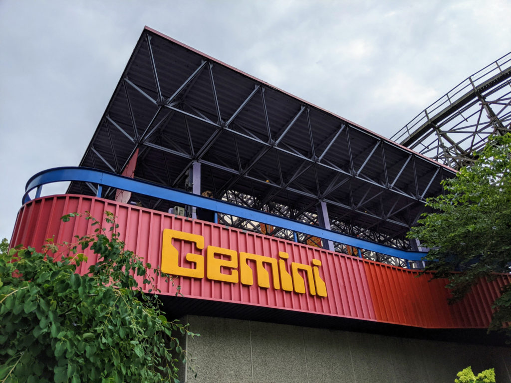 Back on the Main Midway, if you head straight back and under the Corkscrew roller coaster, you’ll be on the Gemini Midway. If there’s a theme here, it’s color and fun, with a slight emphasis on the ’80s. There’s the aforementioned Corkscrew looping over the midway, and the Power Tower, with two turbo drop towers and two power shot towers. The Top Thrill Dragster is to your left (and the entrance is farther down than you think.)