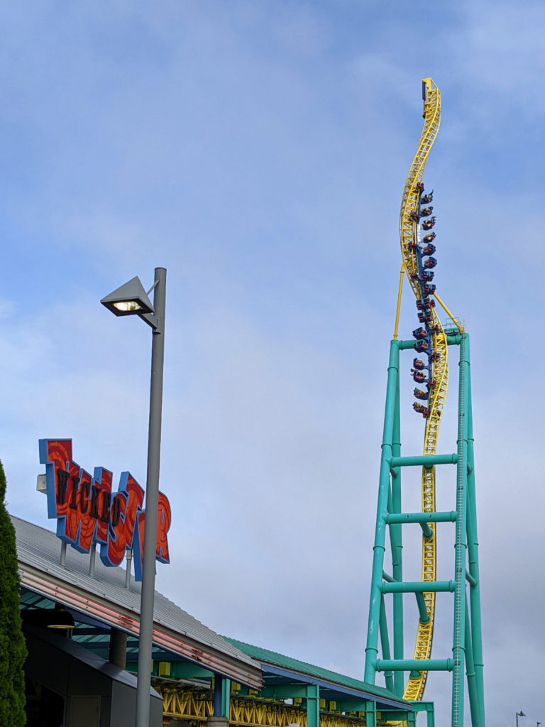 Behind all the kid’s rides is the Lakeside Midway, with rides right on the beach. Walking back to it past all the gaming booths, there’s the maXair giant swinging pendulum ride (which I never saw operating) and the Gatekeeper wing coaster that flips riders over the entrance gate. Next is a gondola-style Giant Wheel with Troika and Tiki Twirl flat rides, and Dodgem bumper cars. Behind all that is the soon-to-be-replaced Wicked Twister inverted impulse coaster (like a big “U.”) Finishing off that corner flies the Windseeker tower swings -the most perfectly situated example of its kind.