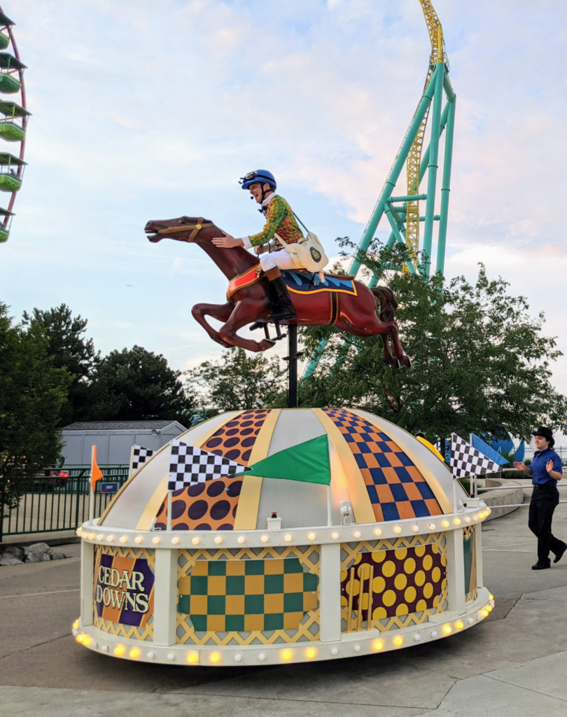 And unlike most theme parks, this area is chock-full of attractions! Besides the scenic Sky Ride down the middle of the midway, a beautiful vintage carousel is right inside the gates, with Ocean Motion swinging pirate ship just to the right. A roller coaster zooms right over the entrance to the park (though it’s technically part of a separate area.) The Raptor inverted coaster is right on the main midway to the left. The Cadillac Cars track ride and the historic Cedar Downs racing carousel are a little farther down on the left. At the far end are the Scrambler and Matterhorn flat rides.