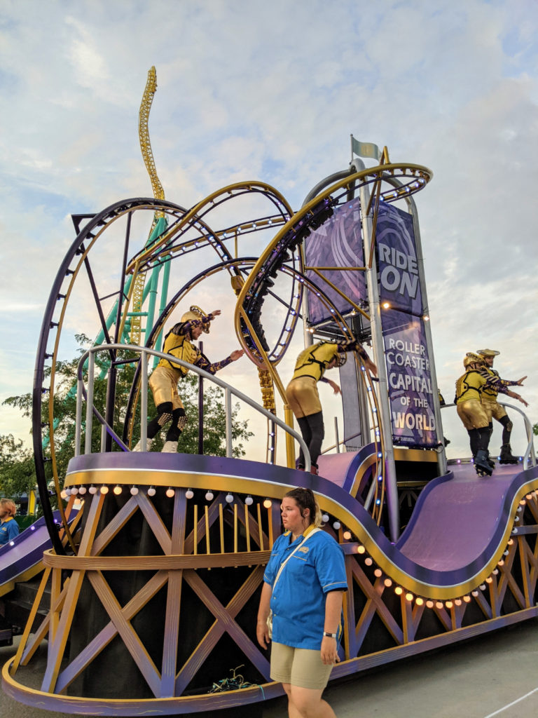 The parade starts near Gatekeeper and winds down then back up the Main Midway to a stage set up near Millenium Force. The floats are then arranged around the stage (and sometimes take part in the action.) The show itself was a run-through of the park’s history, as told through song and dance. Meaning, they’d talk about the beach days and have a “beach party,” then they’d get to the ’70s and have a disco, that sort of thing. It was really just like a regular theme park show, just amped up to a thousand. BUT, there was a great DJ/lead singer, and several of the parade cast were involved, like the guys on skates and some pogo stick stunts. Overall, it was fun, fire and fireworks shot out of the top of the stage, and it was a good time.