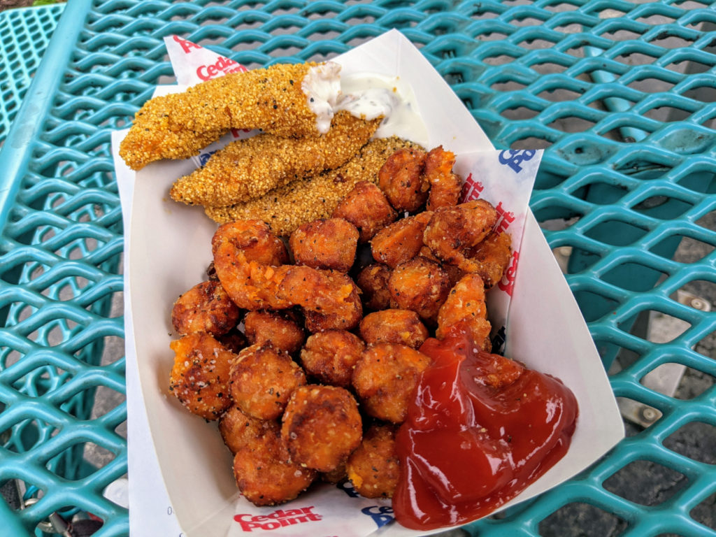 Overall, the food is MUCH better than my previous experience at Carowinds. There’s a fresh french fry place on the Main Midway, a walking taco stand, gourmet mac & cheese, plus all the ice cream, burgers, and chicken fingers you could want all over. A good BBQ place with a live music stage (“BackBeatQue”) is next to the entrance to the water park near Magnum. The sole “healthy” option is back by Thunder Canyon in the back of the park, with gluten-free chicken fingers, sweet potato tots, cauliflower pizza, and salads. And once, I really enjoyed a Hawaiian burger at a firetruck parked below the Corkscrew.