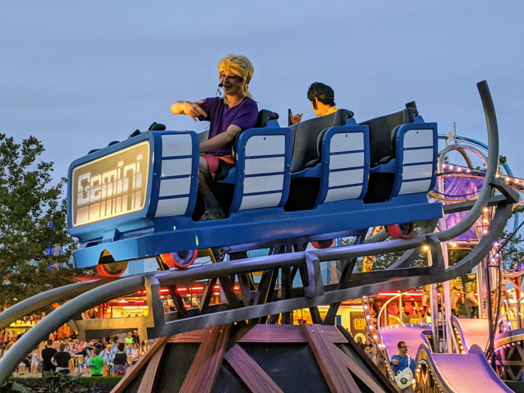 The best ice cream is at Tuft’s at the front of the park, though there’s also a frozen yogurt place near Gemini that looks good. Plus, there are several third-party options like Chickfila, Auntie Anne’s pretzels, Cinnabon, Panda Express, and Subway. There are several spots to refill on sodas or beer. I assume they also hand out free ice water, but I carry a water bottle that is easy to refill at water fountains near bathroom stops.
