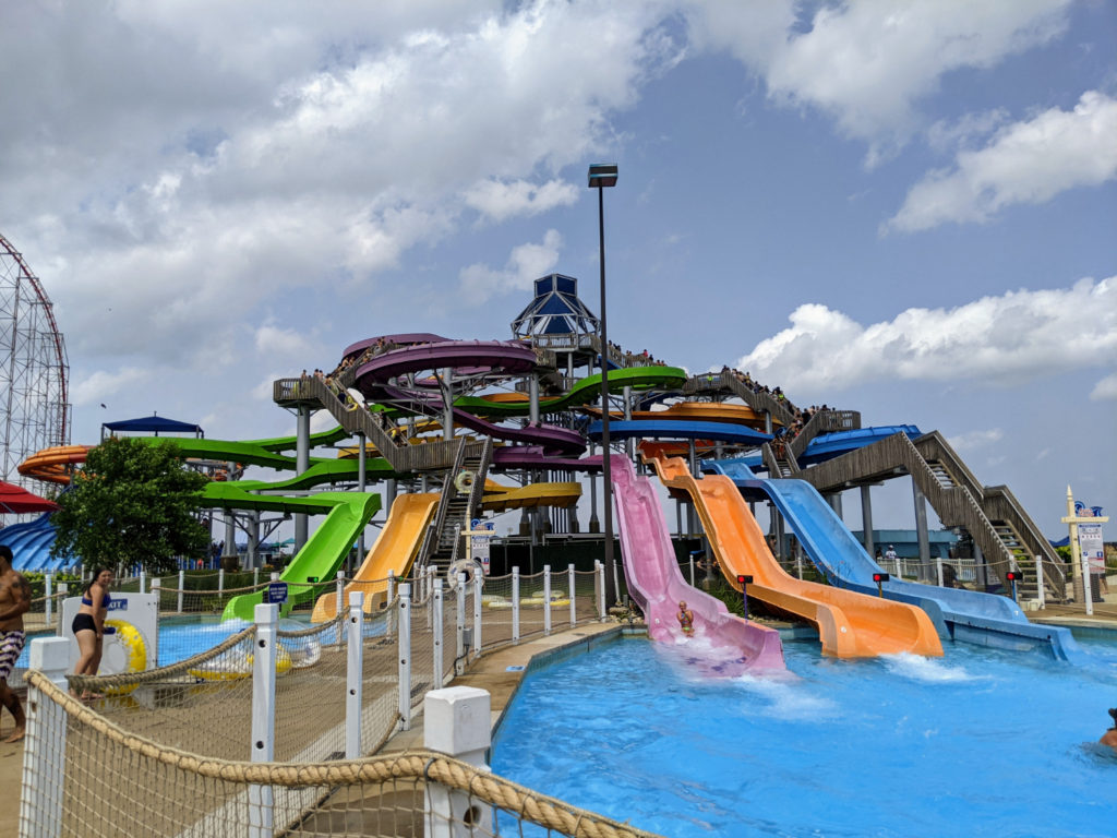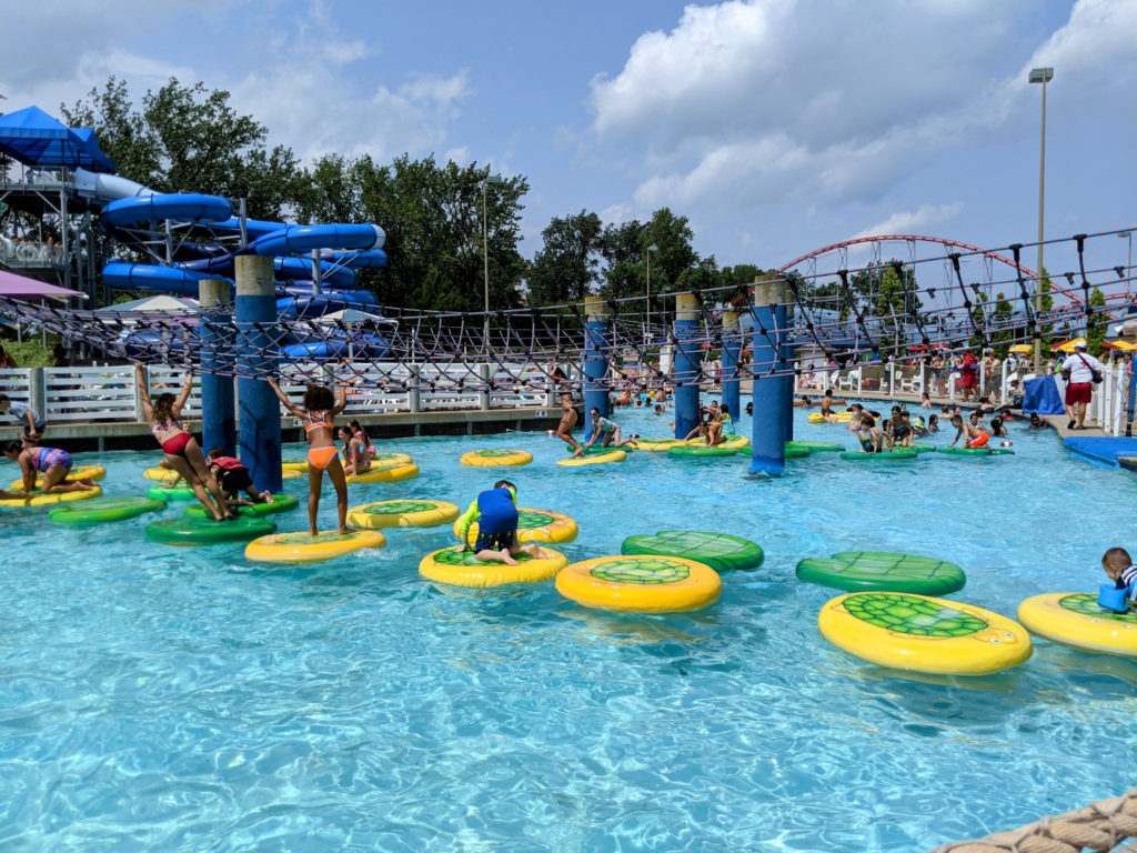 At Cedar Shores, there are 18 water slides on 6 towers, a wave pool, TWO lazy rivers, four kid’s areas, and one adults-only pool with a bar in it. There’s another bar by the wave pool, three counter-service restaurants, and an ice cream spot. And like most water parks, there’s one main gift shop selling everything from swimsuits and towels to souvenirs. Lockers can be found near the bathhouse to the right and near the wave pool to the left.