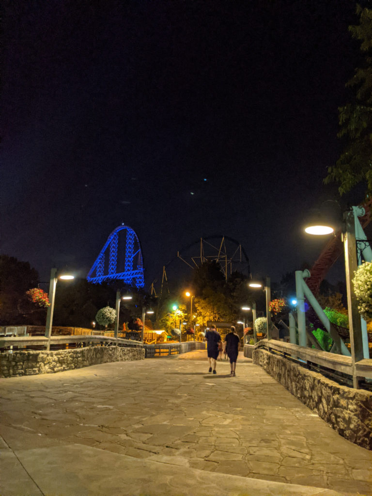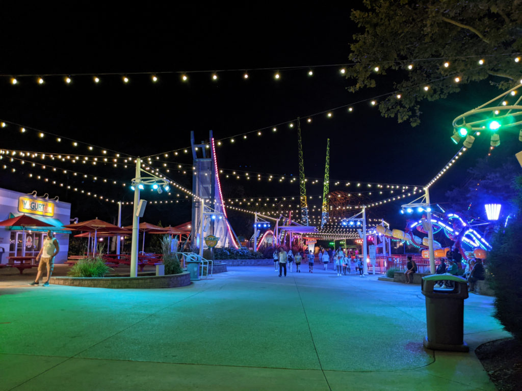 Then I returned a month later for one evening and morning and was able to ride Gatekeeper and Top Thrill Dragster, which were closed before. I also saw the anniversary show, which I had missed. It was during this visit that I took a nice walk through the park after closing, going counterclockwise around the loop after the show. It’s so nice to walk through when everything is lit up and peaceful.